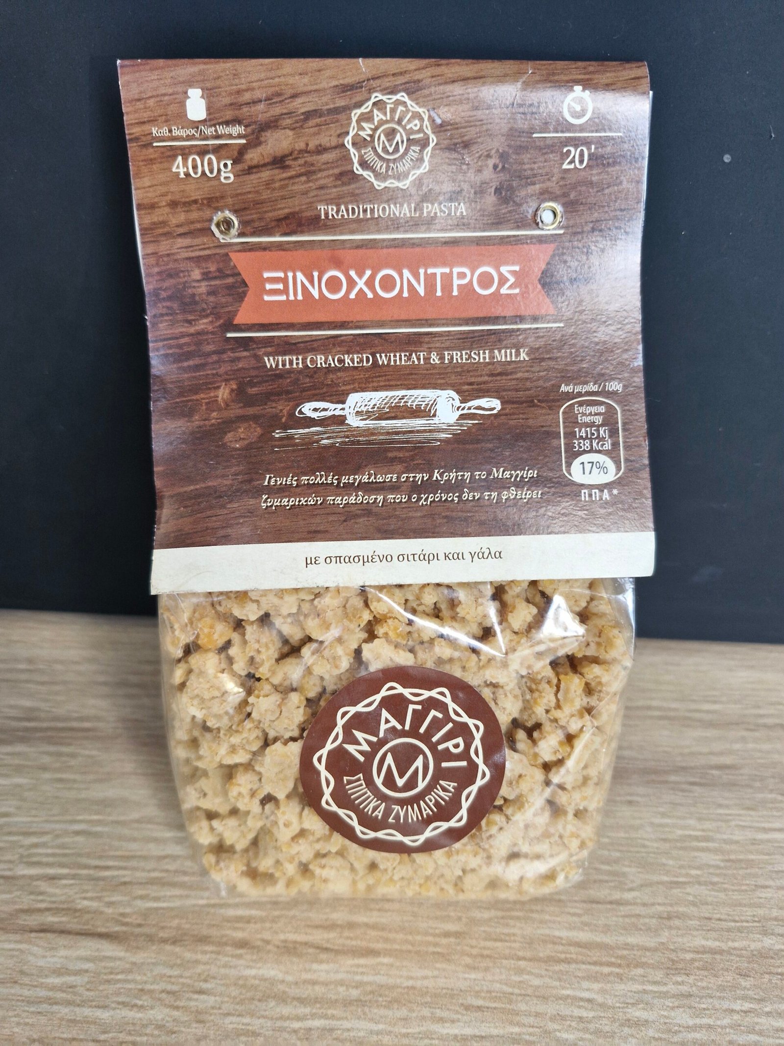 Le mode de confection du xinochondros part d’une pâte non pétrie comportant les mêmes ingrédients de base (farine ou semoule de blé et lait fermenté) que le trachanas; cette panade est cuite jusqu’à durcissement et ensuite morcelée à la main (sans râpe ni tamis). Les grumeaux ainsi réalisés.
